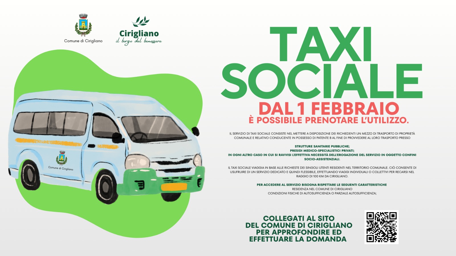 Il Comune di Cirigliano informa la cittadinanza che, con Deliberazione di Consiglio Comunale n. 28 del 27.10.2025, esecutiva ai sensi di legge, è stato approvato il Regolamento comunale del Servizio di Taxi Sociale, istituito per rispondere alle esigenze di mobilità delle fasce più fragili della popolazione, in particolare anziani, persone con disabilità e cittadini affetti da patologie, anche in considerazione della distanza del territorio comunale dai principali presidi ospedalieri .
