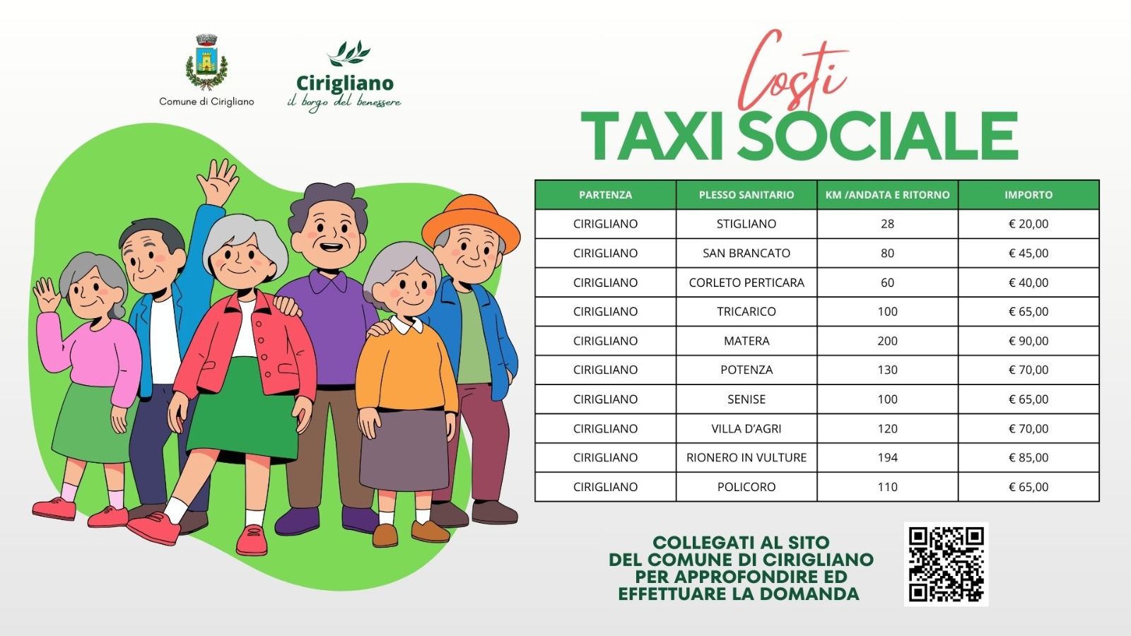 Il Comune di Cirigliano informa la cittadinanza che, con Deliberazione di Consiglio Comunale n. 28 del 27.10.2025, esecutiva ai sensi di legge, è stato approvato il Regolamento comunale del Servizio di Taxi Sociale, istituito per rispondere alle esigenze di mobilità delle fasce più fragili della popolazione, in particolare anziani, persone con disabilità e cittadini affetti da patologie, anche in considerazione della distanza del territorio comunale dai principali presidi ospedalieri .